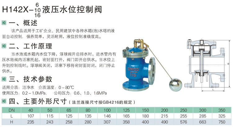 H142X型液壓水位控制閥,H142X型液壓水位控制閥原理、技術參數,H142X型液壓水位控制閥尺寸。H142X型液壓水位控制閥屬于全自動水位控制閥,不需要電,全自動工作模式,是一種自動控制水箱、水塔液面高度的水力控制閥。規格口徑DN40到DN200。